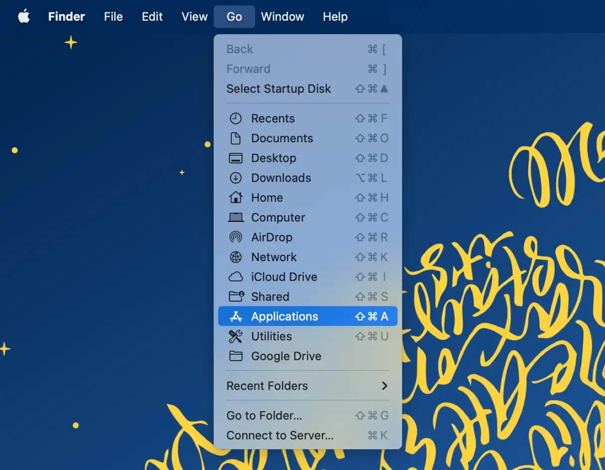 - في نافذة Finder جديدة، انقر فوق “انتقال” (Go) ثم “التطبيقات” (Applications).