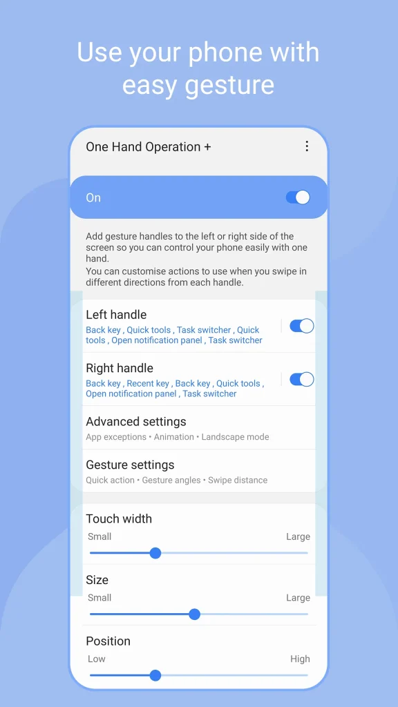 تطبيق One Hand Operation+ يقدم حلاً فعالاً لهذه المشكلة، حيث يضيف مقابض إيماءات على حافتي الشاشة لتفعيل إجراءات مختلفة عن طريق السحب.