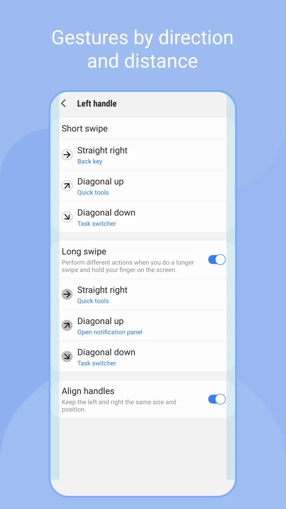يوفر لك التطبيق 12 اختصارًا قابلاً للتخصيص من كل جانب، من خلال تعيين إيماءات سحب قصيرة وطويلة في ثلاثة اتجاهات: مستقيم، قطريًا للأعلى، وقطريًا للأسفل.