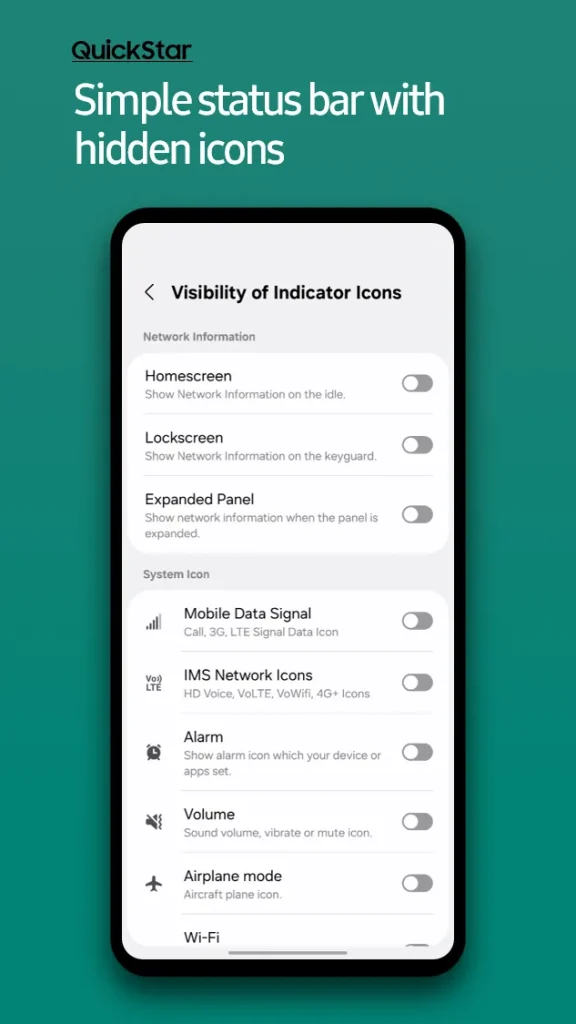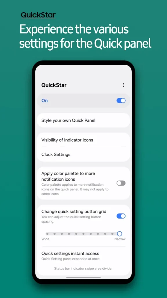 يتيح لك QuickStar تنظيف شريط الحالة واللوحة السريعة. يمكنك إخفاء أيقونات شريط الحالة عن طريق إيقاف تشغيل ما لا تحتاجه، وتخصيص مظهر اللوحة السريعة بألوانك المفضلة للخلفية والمفاتيح والنصوص. باستخدام QuickStar، يمكنك تخصيص تجربة Android الخاصة بك لتناسب احتياجاتك وتفضيلاتك بشكل أفضل، مما يزيد من إنتاجيتك ويقلل من عوامل التشتيت.
