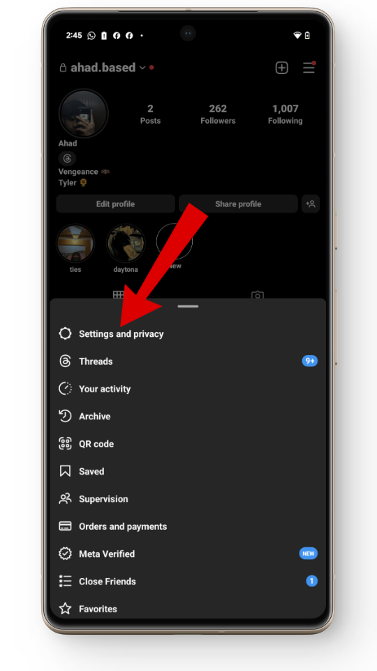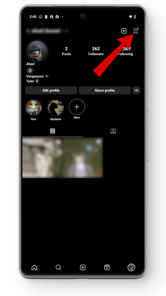 - انتقل إلى ملفك الشخصي في Instagram واضغط على الخطوط الثلاثة في الزاوية العلوية اليمنى.