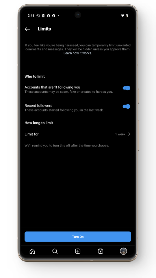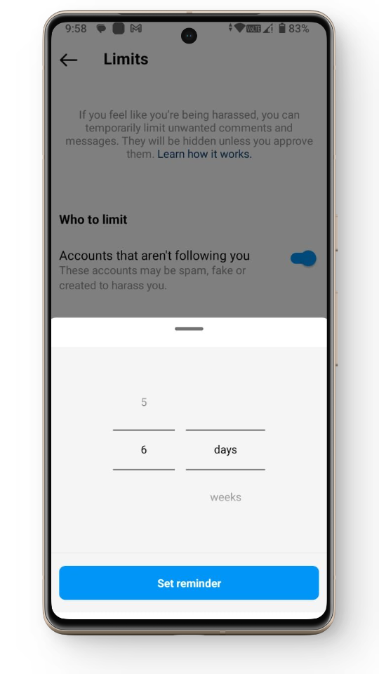 تعمل ميزة الحد بشكل مختلف قليلاً. فهي لا تقتصر على تقييد التعليقات فحسب، بل تحد أيضًا من يمكنه مراسلتك. هذه الحدود مؤقتة ويمكن أن تتراوح من يوم واحد إلى 4 أسابيع.