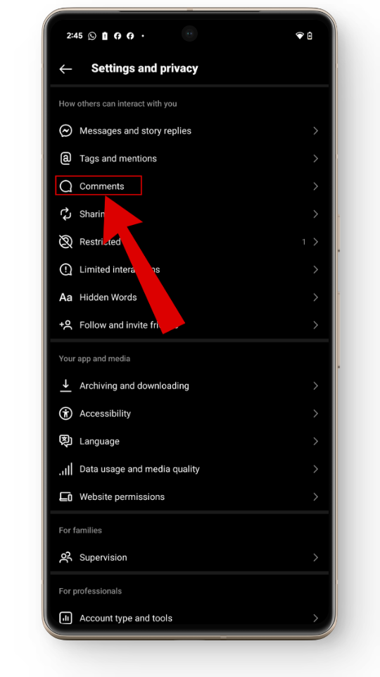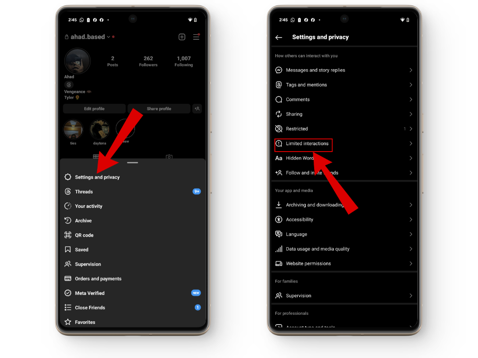 - انتقل إلى الإعدادات والخصوصية > التفاعلات المحدودة.