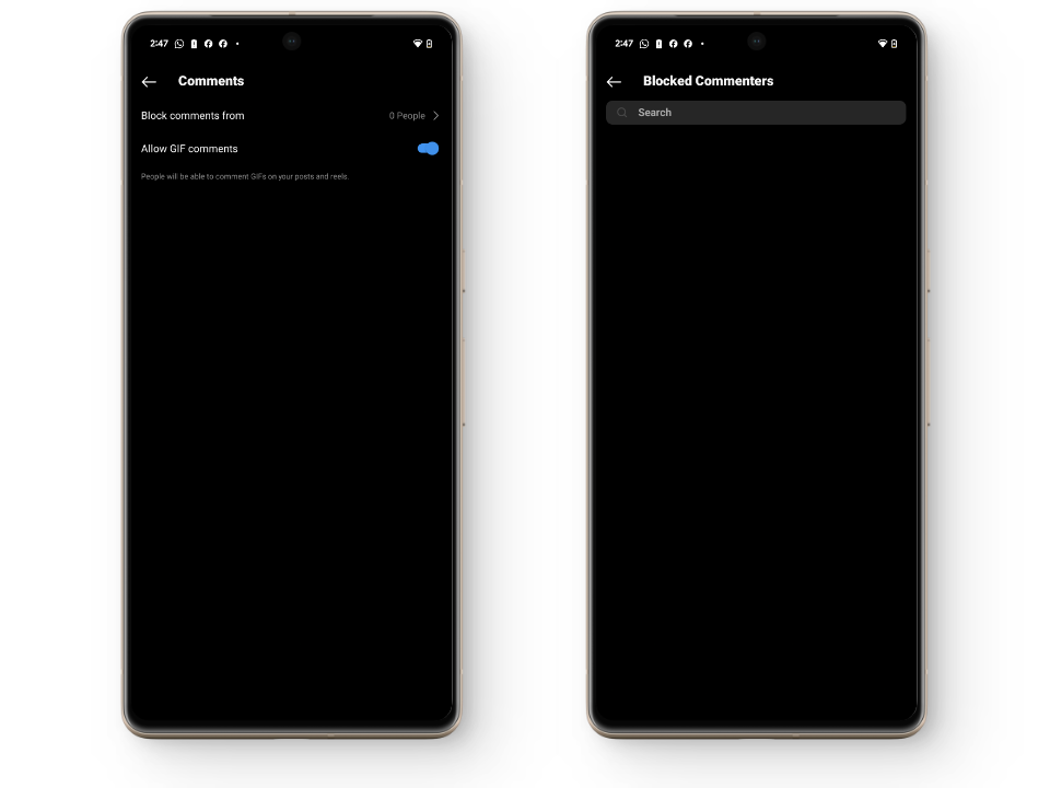 - هنا، يمكنك حظر التعليقات من حسابات معينة عن طريق إضافة أسماء المستخدمين الخاصة بهم إلى قائمة المعلقين المحظورين لديك. ستجد أيضًا خيارًا للسماح بتعليقات GIF أو حظرها أسفل منشوراتك.