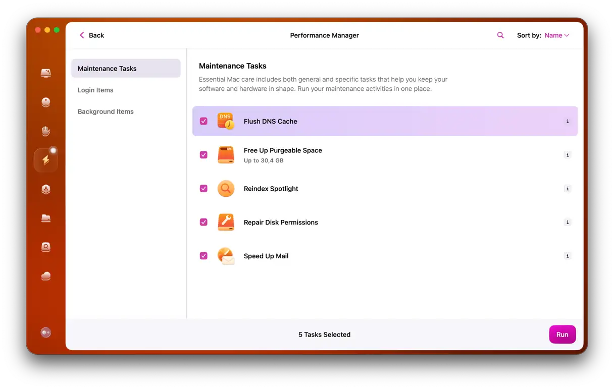 بعد تشغيل الوضع الآمن، قمت بفتح برنامج CleanMyMac واستخدمت ميزة “الأداء” (Performance) لتنفيذ بعض المهام الضرورية لتحسين أداء النظام. إليك كيفية القيام بذلك: