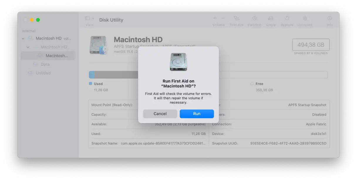 - انقر فوق First Aid (الإسعافات الأولية)، ثم Run (تشغيل). ستقوم الأداة بفحص القرص بحثًا عن الأخطاء ومحاولة إصلاحها. قد تستغرق هذه العملية بعض الوقت، لذا كن صبوراً.