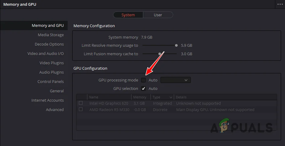 - انتقل إلى Resolve > Preferences > System > Memory and GPU.