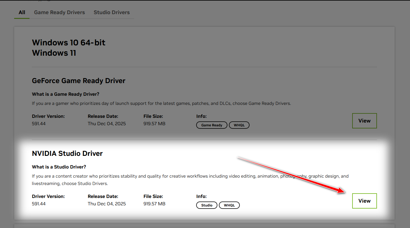 إذا كنت تستخدم وحدة معالجة رسومات (GPU) من NVIDIA، فعادةً ما يتم اختبار برامج تشغيل Studio بشكل أكبر مقارنة بأعباء العمل الإبداعية (Resolve، Premiere، Blender). تم تحسين برامج تشغيل Game Ready لإصدارات الألعاب الجديدة، ولكنها تقدم أحيانًا أخطاء في الحساب/التصدير تظهر كأخطاء في العرض. يعد التبديل إلى Studio أحد أسرع التحركات “التي تعطي الأولوية للاستقرار”.
