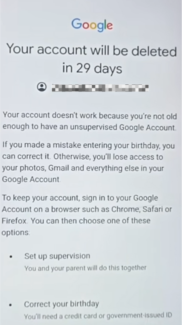 إذا كان تاريخ الميلاد المرتبط بحسابك على Google يشير إلى أنك أصغر من 13 عامًا، فستقوم Google بجدولة حسابك للحذف. سيُمنحك 14 يومًا لاتخاذ إجراء واستعادة حسابك. إذا لم يتم اتخاذ أي إجراء، فسيتم تعطيل الحساب، وسيتم حذف جميع البيانات بشكل دائم في اليوم الثلاثين.