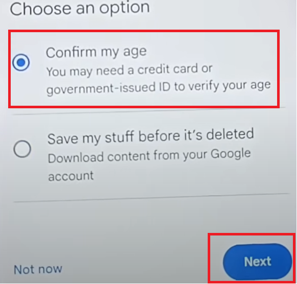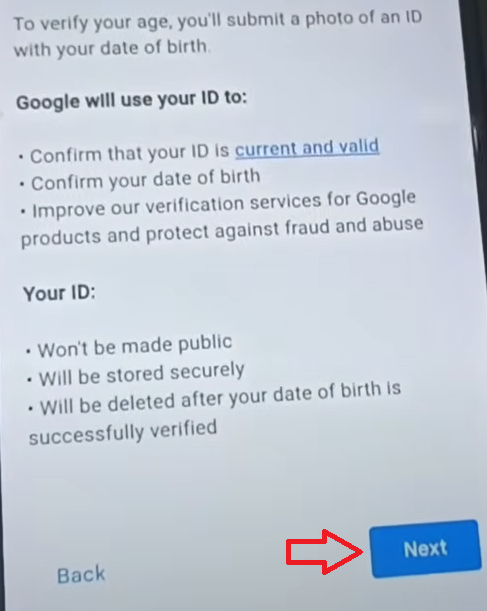 - انقر على خيار “استخدام هوية صالحة” للتحقق من عمرك (يمكنك أيضًا استخدام بطاقة ائتمان إذا كانت متاحة – قد تجري Google معاملة مؤقتة صغيرة للتحقق).