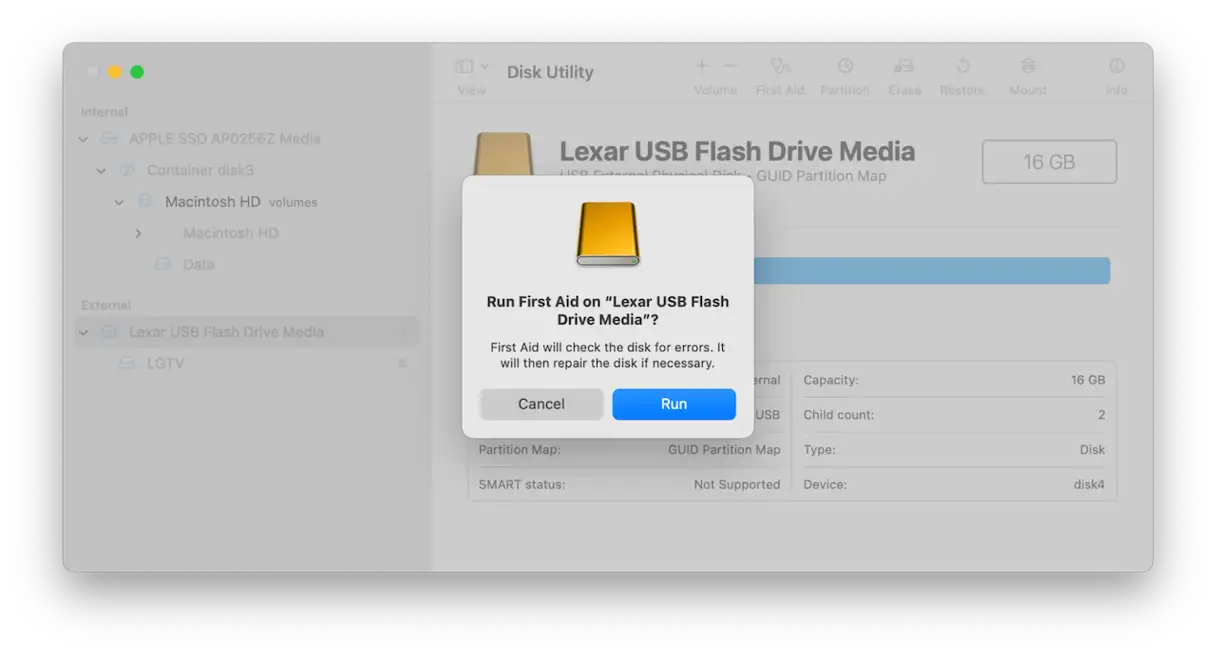 - اختر “Run” وانتظر حتى تحاول Disk Utility إصلاح المشكلة. قد تستغرق هذه العملية بعض الوقت، اعتمادًا على حجم القرص ونوع المشكلة.