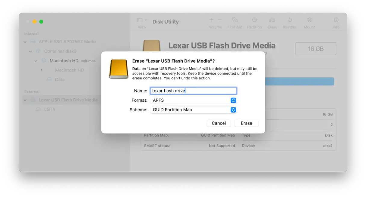- أعطِ القرص اسمًا واختر تنسيقًا. يوصى باختيار APFS (نظام ملفات Apple) ما لم يكن لديك سبب وجيه لاختيار تنسيق آخر. APFS هو نظام الملفات الحديث والأكثر كفاءة لأجهزة Mac.