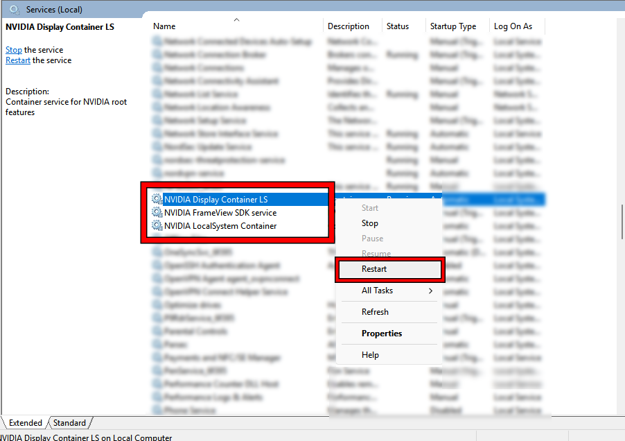 - أعد تشغيل خدمات NVIDIA (عادةً NVIDIA Display Container LS بالإضافة إلى أي إدخالات NVIDIA LocalSystem/NetworkService Container).