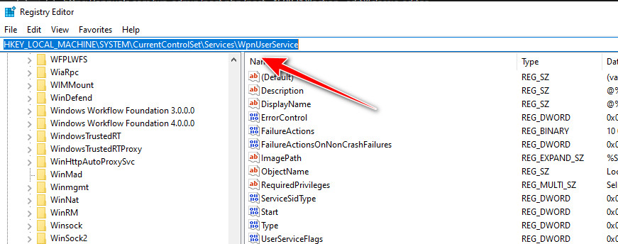 - انتقل إلى:HKEY_LOCAL_MACHINESYSTEMCurrentControlSetServicesWpnUserService