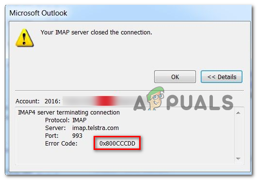 يُفيد بعض مستخدمي Outlook بأنهم يواجهون باستمرار خطأ 0x800CCCDD (‘أغلق خادم IMAP الخاص بك الاتصال‘) عند إرسال أو استقبال رسائل البريد الإلكتروني عبر حساب IMAP. يشير رمز الخطأ هذا تحديدًا إلى فشل ميزة الإرسال/الاستلام.