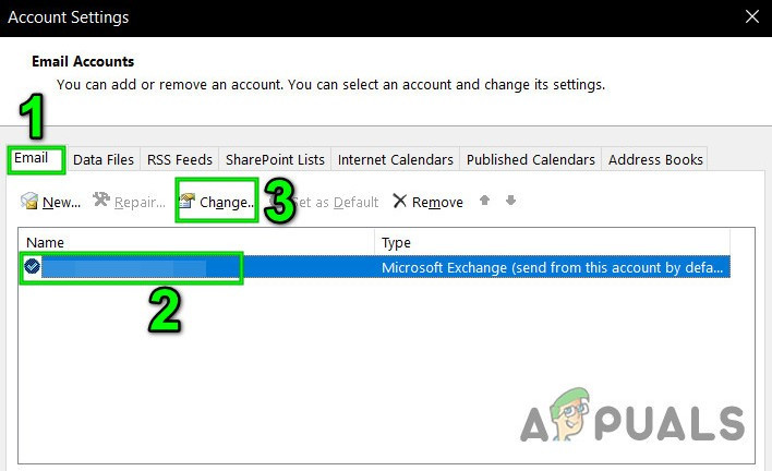 - من قائمة إعدادات الحساب، انقر على علامة التبويب البريد الإلكتروني، ثم حدد البريد الإلكتروني الذي تواجه مشكلات معه واضغط على زر تغيير من قائمة الخيارات المتاحة.