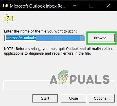 - بمجرد أن تتمكن من العثور على أداة PSTScan.exe المساعدة، افتحها وانقر على Browse (استعراض) لتعيين مسار ملف PST الخاص بك. بعد أن تتمكن من تحميل الملف الصحيح في أداة إصلاح علبة الوارد، انقر على Start (بدء) للبحث عن أي تلف.
