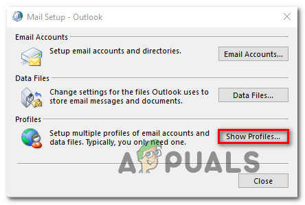 ملاحظة: يمكنك استخدام شريط البحث للعثور عليه بسهولة. - بمجرد وصولك إلى نافذة إعداد البريد، انقر على إظهار ملفات التعريف ضمن ملفات التعريف.