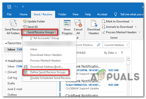 - بمجرد تسجيل الدخول بنجاح، انقر على علامة التبويب إرسال/استلام من قائمة الشريط في الأعلى. بعد ذلك، انقر على القائمة المنسدلة مجموعات الإرسال/الاستلام ثم انقر على تعريف مجموعات الإرسال/الاستلام من قائمة الخيارات المتاحة.
