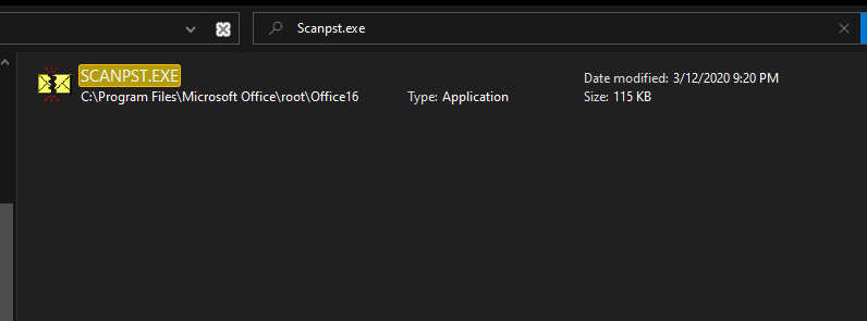 ملاحظة: في حال لم تتمكن من العثور على الملف التنفيذي SCANPST عبر وظيفة البحث، يمكنك محاولة العثور عليه يدويًا في أحد المواقع التالية: