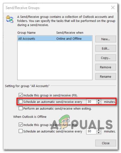 كما يتضح، في غالبية الحالات الموثقة التي تواجه هذه المشكلة، تبين أن السبب هو ميزة الإرسال/الاستلام. ضع في اعتبارك أن هذه الميزة ليست مصممة للعمل مع اتصالات IMAP – فـ IMAP لديه القدرة على المزامنة تلقائيًا دون الحاجة إلى مساعدة Outlook.