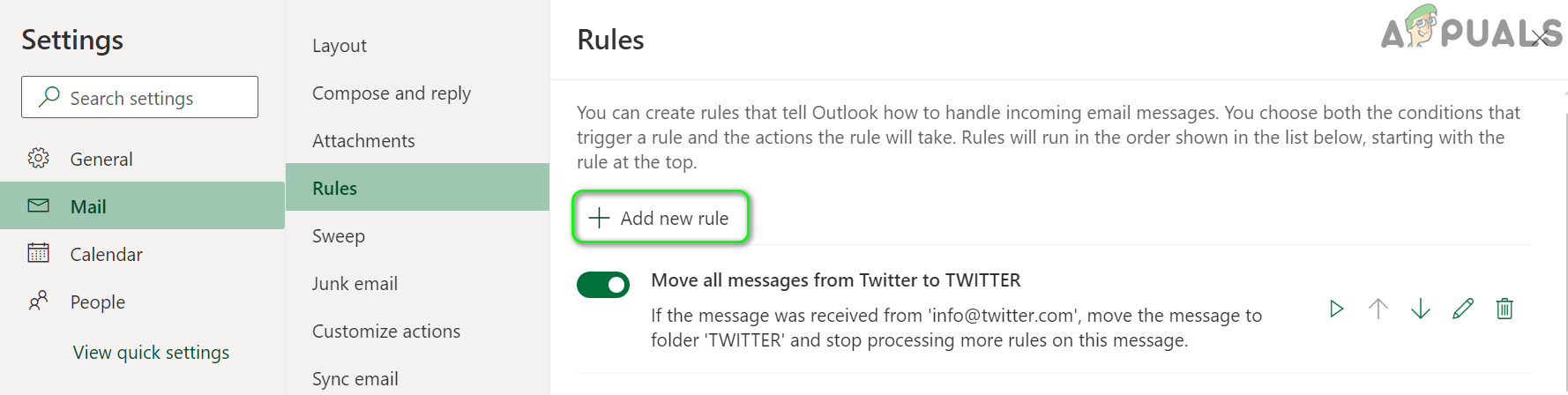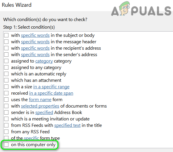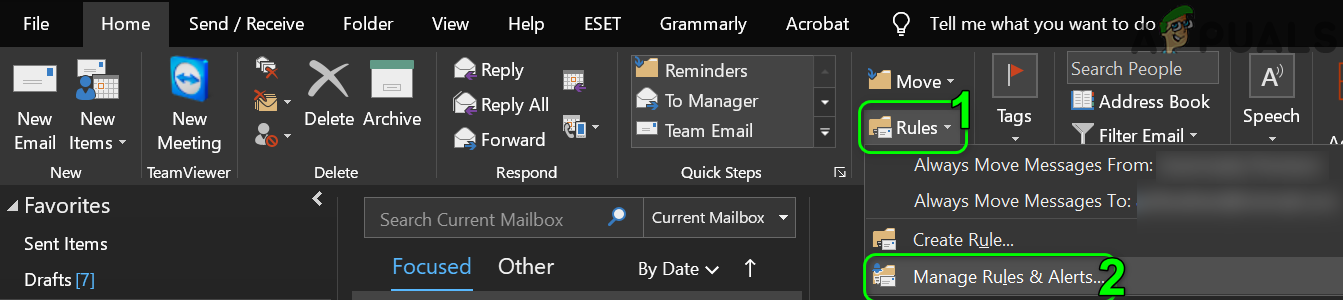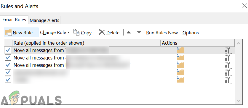 قد تكون قواعد Outlook ناتجة عن خلل مؤقت في الاتصال بين الخادم والعميل أو في وحدات التطبيق. يمكن مسح هذا الخلل عن طريق إعادة تمكين قواعد Outlook.