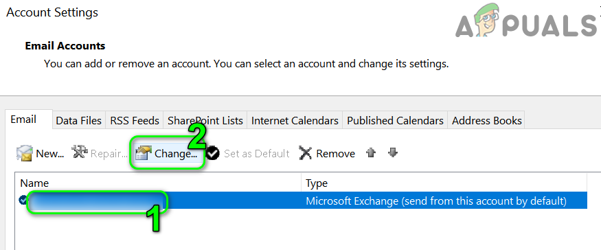 - ثم، حدد الحساب الذي به مشكلة ثم انقر على زر تغيير.
