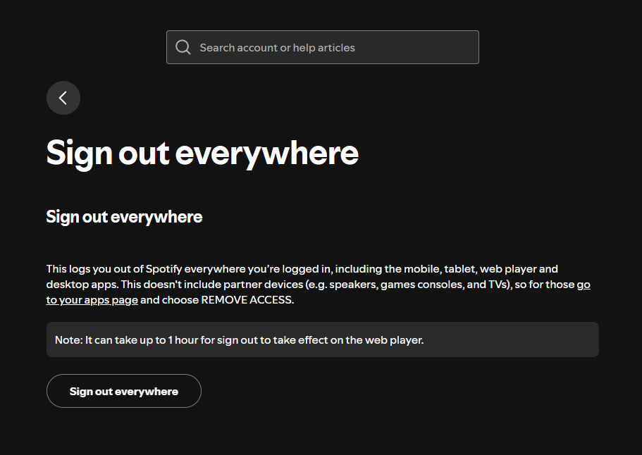 ملاحظة: قد تظل بعض الأجهزة الشريكة (أجهزة التلفزيون ووحدات التحكم ومكبرات الصوت) متصلة. إذا لزم الأمر، قم بإزالة الوصول غير المعروف ضمن قسم التطبيقات في حسابك.