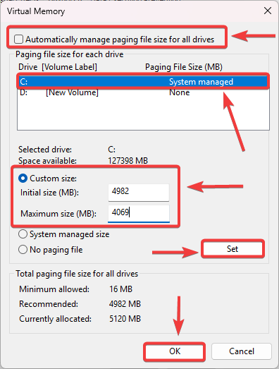 - ألغِ تحديد إدارة حجم ملف ترحيل الصفحات تلقائيًا لجميع محركات الأقراص.