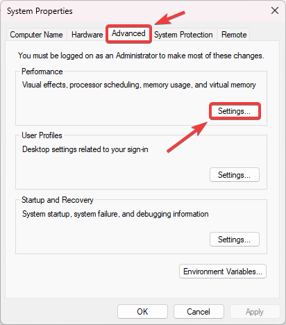 - انتقل إلى علامة التبويب خيارات متقدمة، وتحت الأداء، انقر فوق الإعدادات.