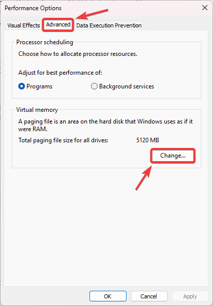 - في خيارات الأداء، انتقل إلى علامة التبويب خيارات متقدمة وانقر فوق تغيير تحت الذاكرة الافتراضية.