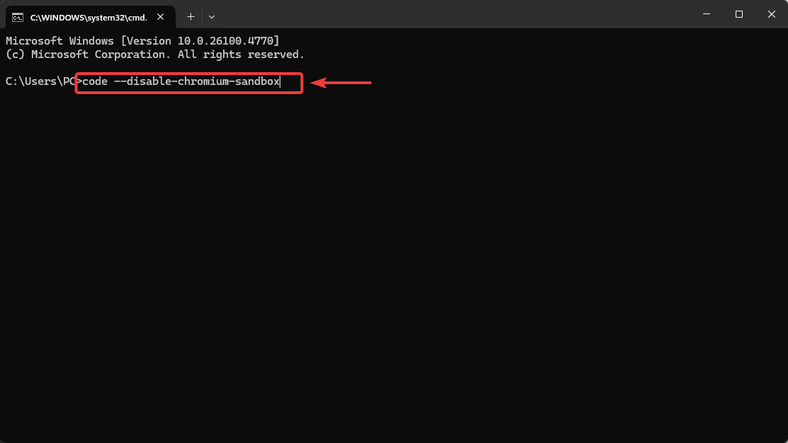 يقيد Chromium sandbox وصول Visual Studio Code إلى موارد النظام لأسباب أمنية. ولكن، إذا كان نظامك أو برامج التشغيل الخاصة بك لا تدعمه بالكامل، فقد يتعطل المحرر أثناء التهيئة. يؤدي تشغيل Visual Studio Code باستخدام العلامة --disable-chromium-sandbox إلى تجاوز هذا التقييد ويسمح للتطبيق بالعمل بدون الـ sandbox.