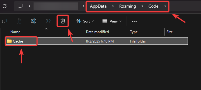 يخزن VS Code بيانات الجلسة المخزنة مؤقتًا وحالات الإضافات والنسخ الاحتياطية ضمن مجلدات ملفه الشخصي. إذا أصبحت هذه الملفات تالفة (بسبب تحديثات فاشلة أو أعطال أو تعارضات)، فقد يتعطل المحرر عند التشغيل. يؤدي حذف مجلدات ذاكرة التخزين المؤقت هذه إلى إجبار VS Code على إعادة إنشائها، مما يحل المشكلة غالبًا.