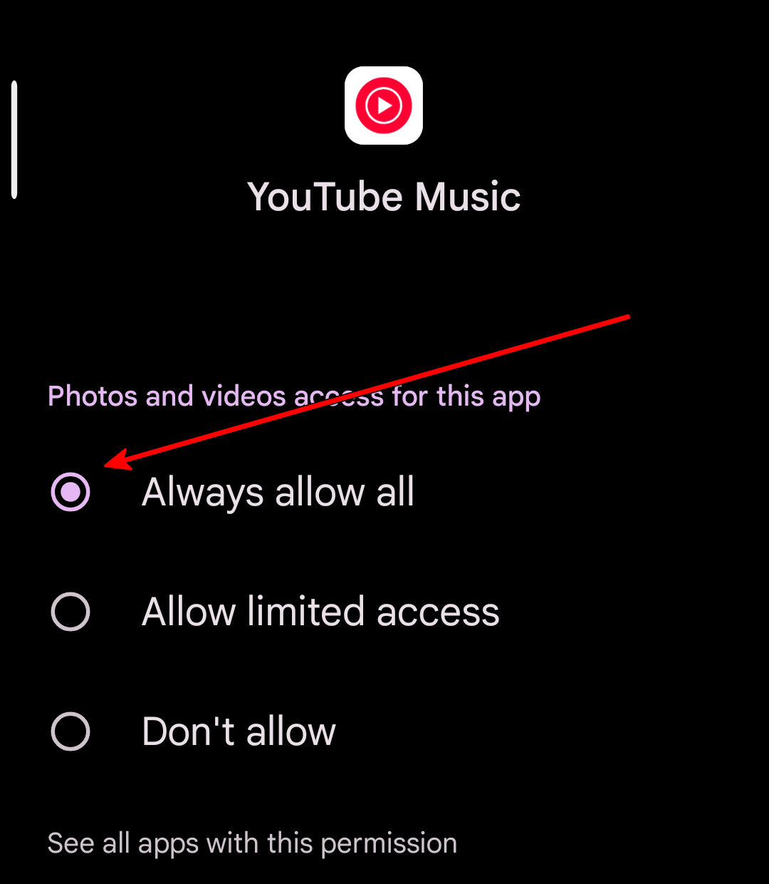 5. افتح الصور ومقاطع الفيديو أو الصور ومقاطع الفيديو إذا كانت متاحة، ثم حدد السماح دائمًا بالوصول الكامل.
