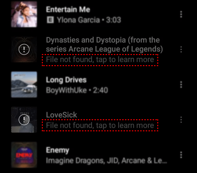 3. ابحث عن أي أغنية أو قائمة تشغيل تظهر عليها رسالة “الملف غير موجود”.