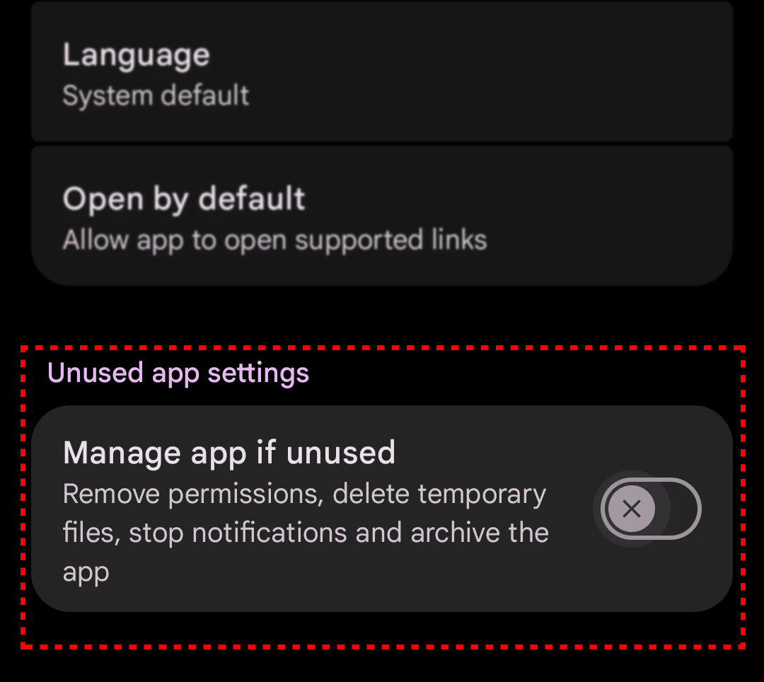 4. قم بتعطيل هذا الخيار لإيقاف Android عن إلغاء الأذونات أو مسح ذاكرة التخزين المؤقت للتطبيق تلقائيًا.