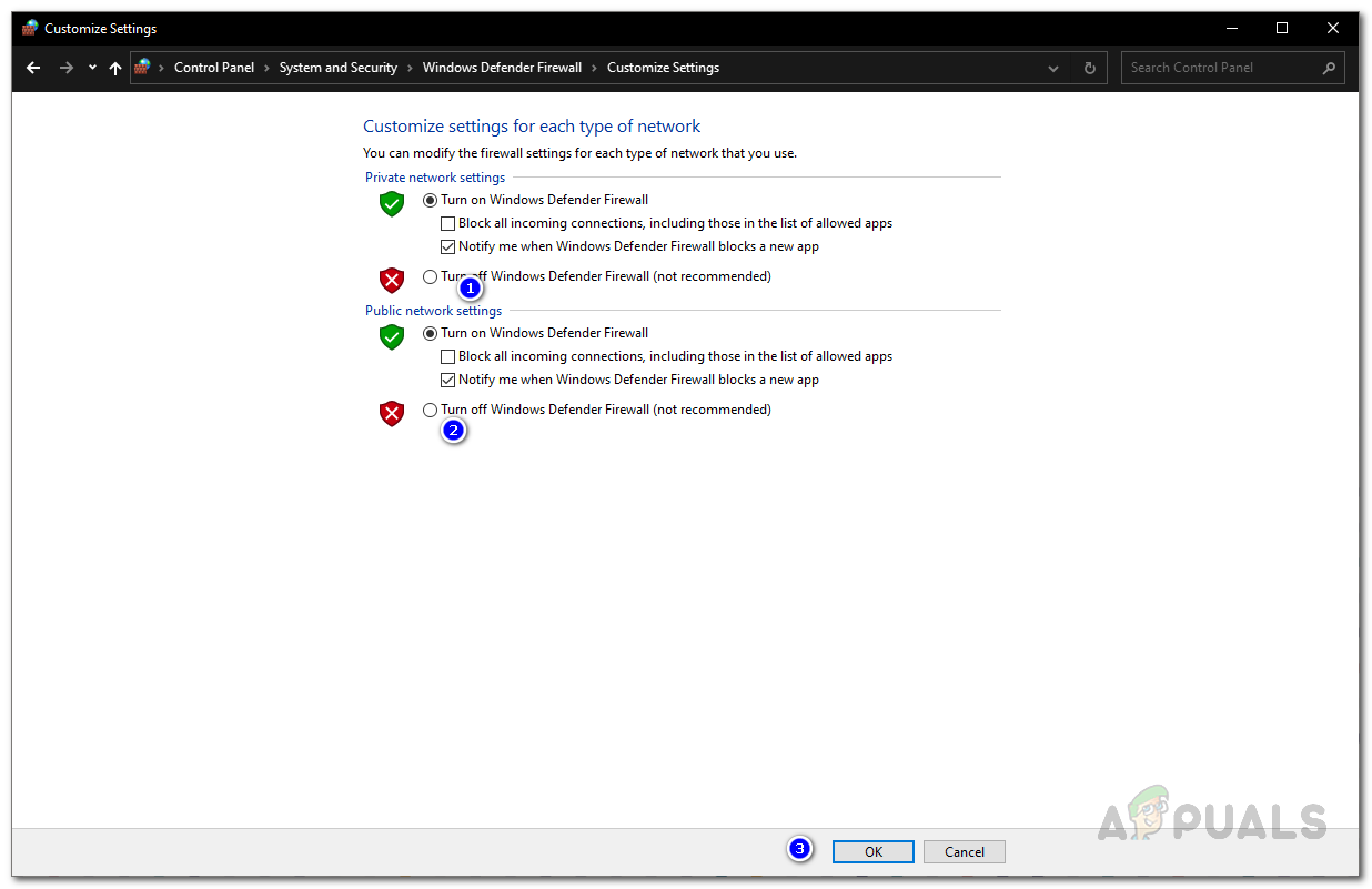- حدد Turn off Windows Defender Firewall (إيقاف تشغيل جدار حماية Windows Defender) لكل من إعدادات الشبكة Private (الخاصة) و Public (العامة).