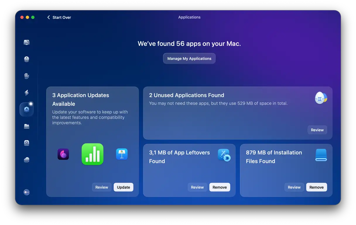 عند تشغيل هذه الميزة، سترى أن هذه الأداة يمكنها فعل أكثر من مجرد إلغاء تثبيت التطبيقات؛ فهي تساعدك على تحديد التطبيقات غير المستخدمة التي قد تثقل كاهل نظامك بلا داع، وتحديد موقع بقايا التطبيقات، وإزالة ملفات التثبيت. هذا يضمن لك الحفاظ على جهازك نظيفًا وسريعًا، ويمنع تراكم الملفات غير الضرورية التي قد تؤثر على الأداء. CleanMyMac هو حل شامل لإدارة التطبيقات والحفاظ على أداء جهازك الأمثل.