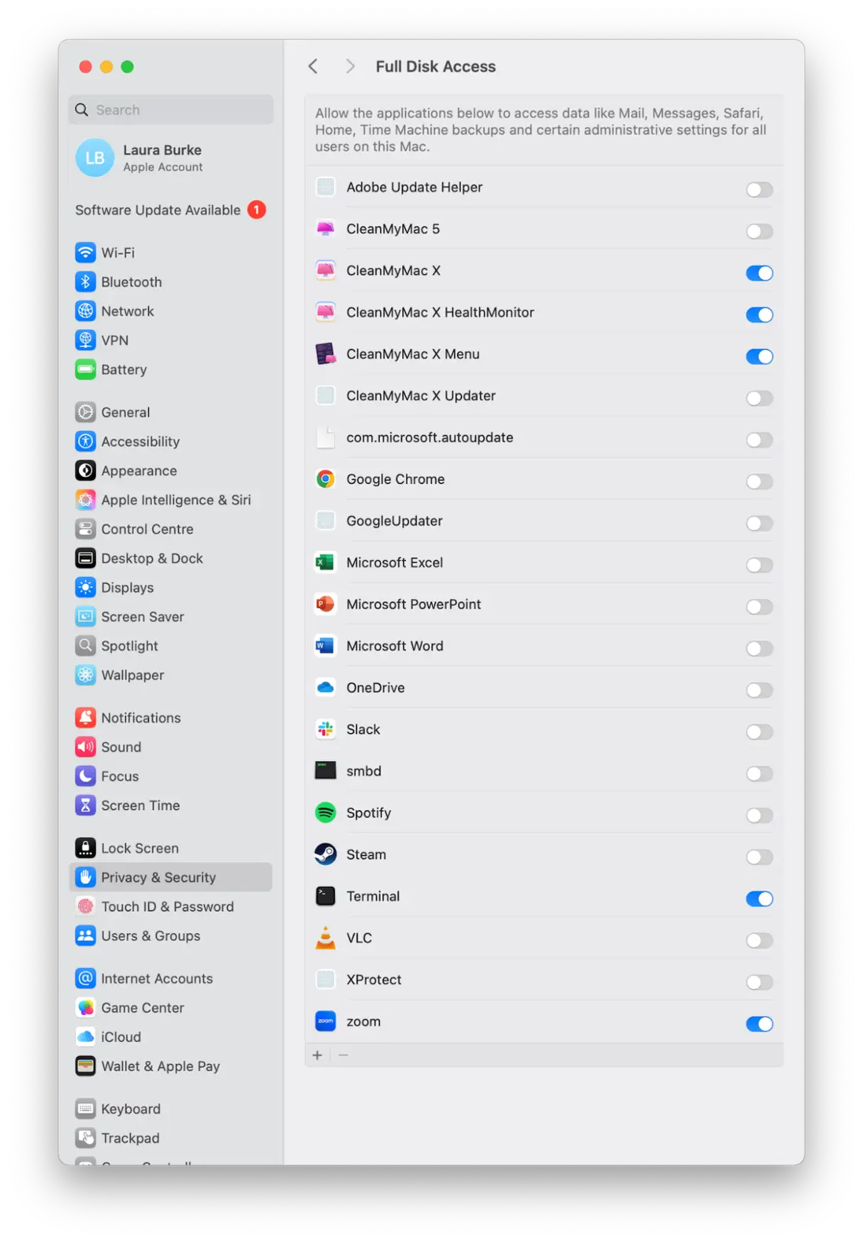 - انتقل إلى “الخصوصية والأمن” (Privacy & Security) > “الوصول الكامل إلى القرص” (Full Disk Access).