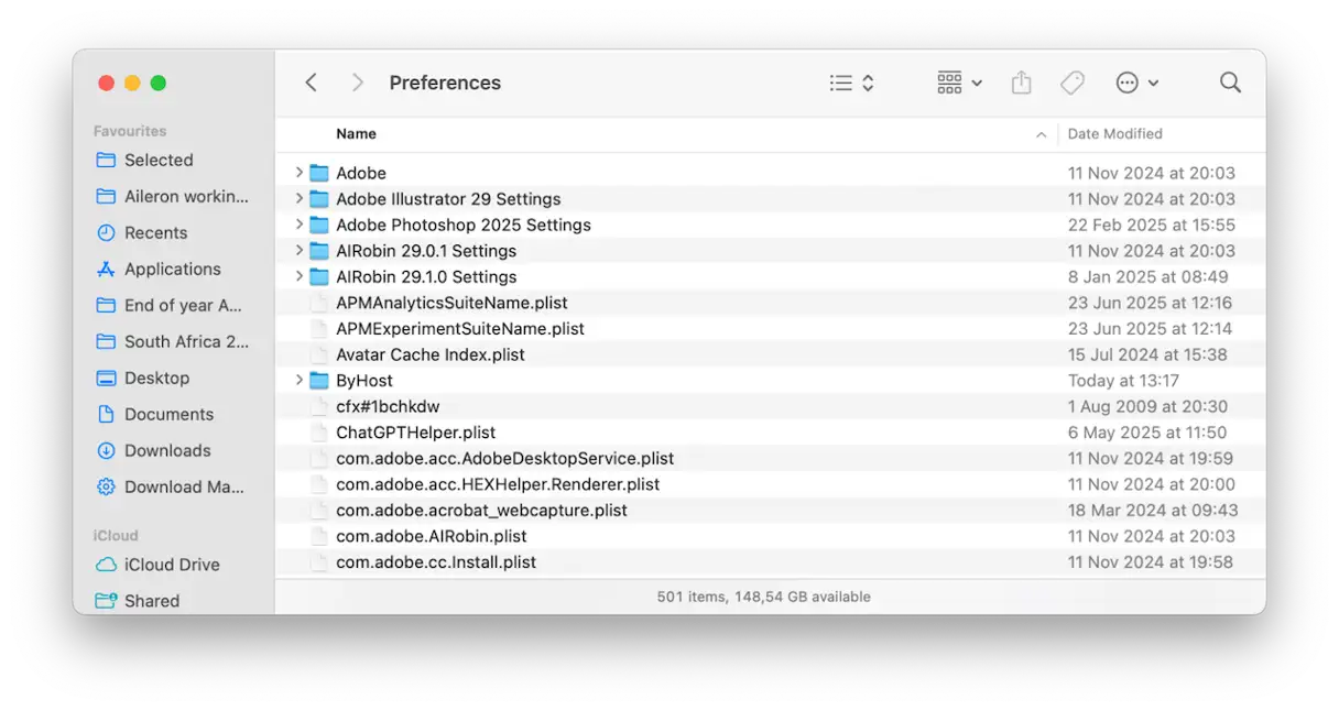 ~/Library/Preferences/. هذا المجلد يحتوي على ملفات التفضيلات لجميع التطبيقات المثبتة على جهاز Mac الخاص بك. - ابحث عن ملف باسم مشابه لـ com.developer.appname.plist. استبدل “appname” باسم التطبيق الذي تواجه معه المشكلة. على سبيل المثال، إذا كانت المشكلة مع تطبيق Photoshop، فقد يكون اسم الملف com.adobe.photoshop.plist.