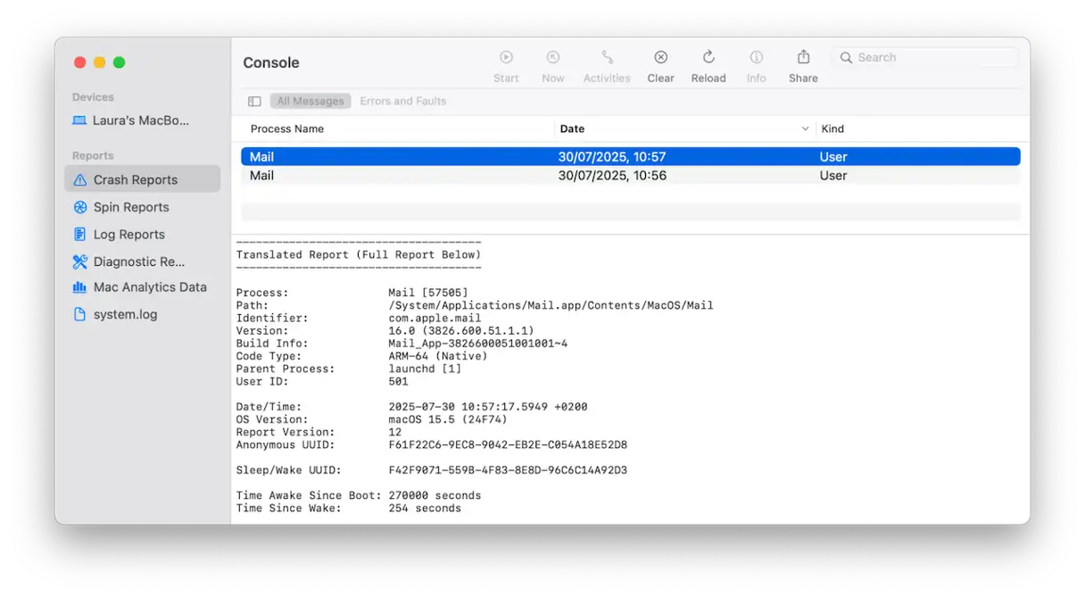 لتحرّي الخلل وإصلاحه بشكل متقدم، يمكنك فحص تطبيق Console بحثًا عن تقارير الأعطال. هذه التقارير توفر معلومات تفصيلية حول سبب توقف التطبيق بشكل غير متوقع، مما يساعد في تحديد المشكلة الجذرية. إليك كيفية القيام بذلك: