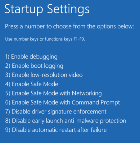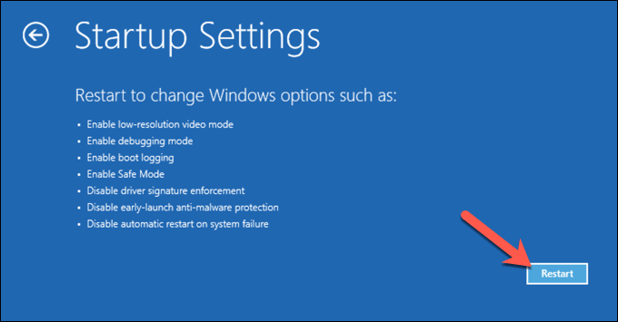 - في قائمة استكشاف أخطاء التمهيد وإصلاحها، حدد Troubleshoot (استكشاف الأخطاء وإصلاحها) > Advanced options (خيارات متقدمة) > Startup Settings (إعدادات بدء التشغيل) > Restart (إعادة التشغيل).