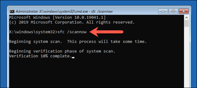 - بعد ذلك، يمكنك التحقق من سلامة ملفات نظام Windows باستخدام أداة System File Checker. اكتب sfc /scannow للبدء. قد يستغرق هذا بعض الوقت حتى يكتمل.