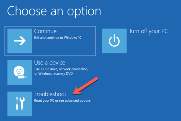 - في قائمة Choose an option، حدد خيار Troubleshoot.