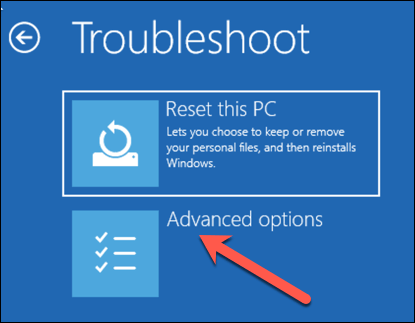 - في قائمة استكشاف الأخطاء وإصلاحها، حدد خيار الخيارات المتقدمة.