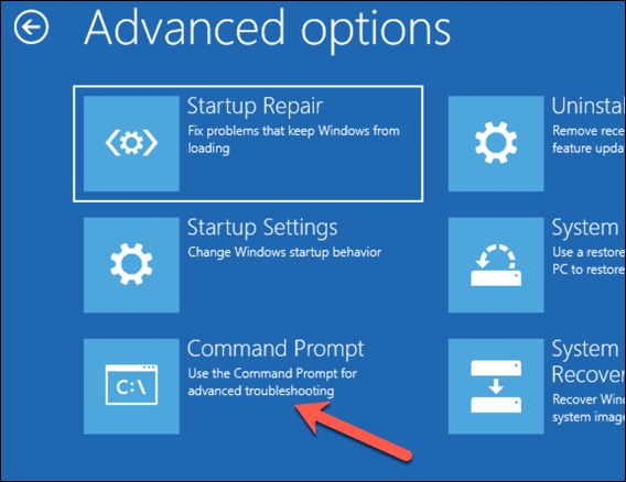 إذا لم تتمكن من تتبع سبب حلقة الإصلاح التلقائي في Windows 10 على الفور، فإن أفضل ما يمكنك فعله هو البدء ببعض أدوات إصلاح النظام الشائعة. على الرغم من أن Windows لا يمكنه التمهيد، إلا أنه يمكنك عادةً إجبار Windows على التمهيد إلى نافذة موجه الأوامر باستخدام شاشة قائمة “الخيارات المتقدمة”.