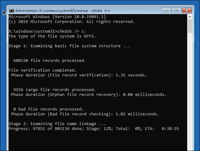 - في نافذة موجه الأوامر، اكتب chkdsk /r c: لبدء فحص منخفض المستوى لمحرك أقراص النظام بحثًا عن أخطاء باستخدام أداة Check Disk. إذا اكتشف أخطاء، فسيقوم الأمر chkdsk بإصلاحها تلقائيًا (إذا أمكن).