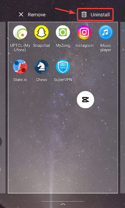 - إذا لم يحل التحديث المشكلة، ألغِ تثبيت تطبيق CapCut بالضغط مطولاً على أيقونة CapCut، ثم حدد إلغاء التثبيت.