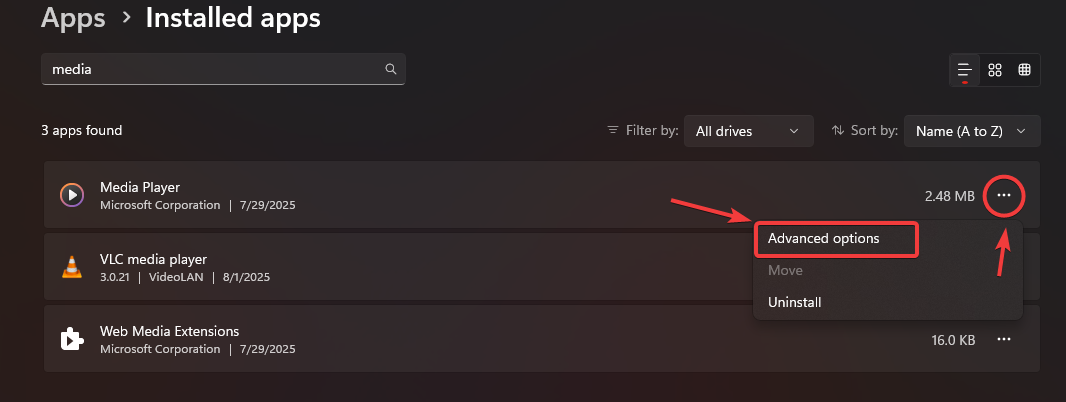 4. انقر على النقاط الثلاث بجانبه واختر خيارات متقدمة.