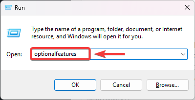1. اضغط على Windows + R، اكتب optionalfeatures، ثم اضغط على Enter.